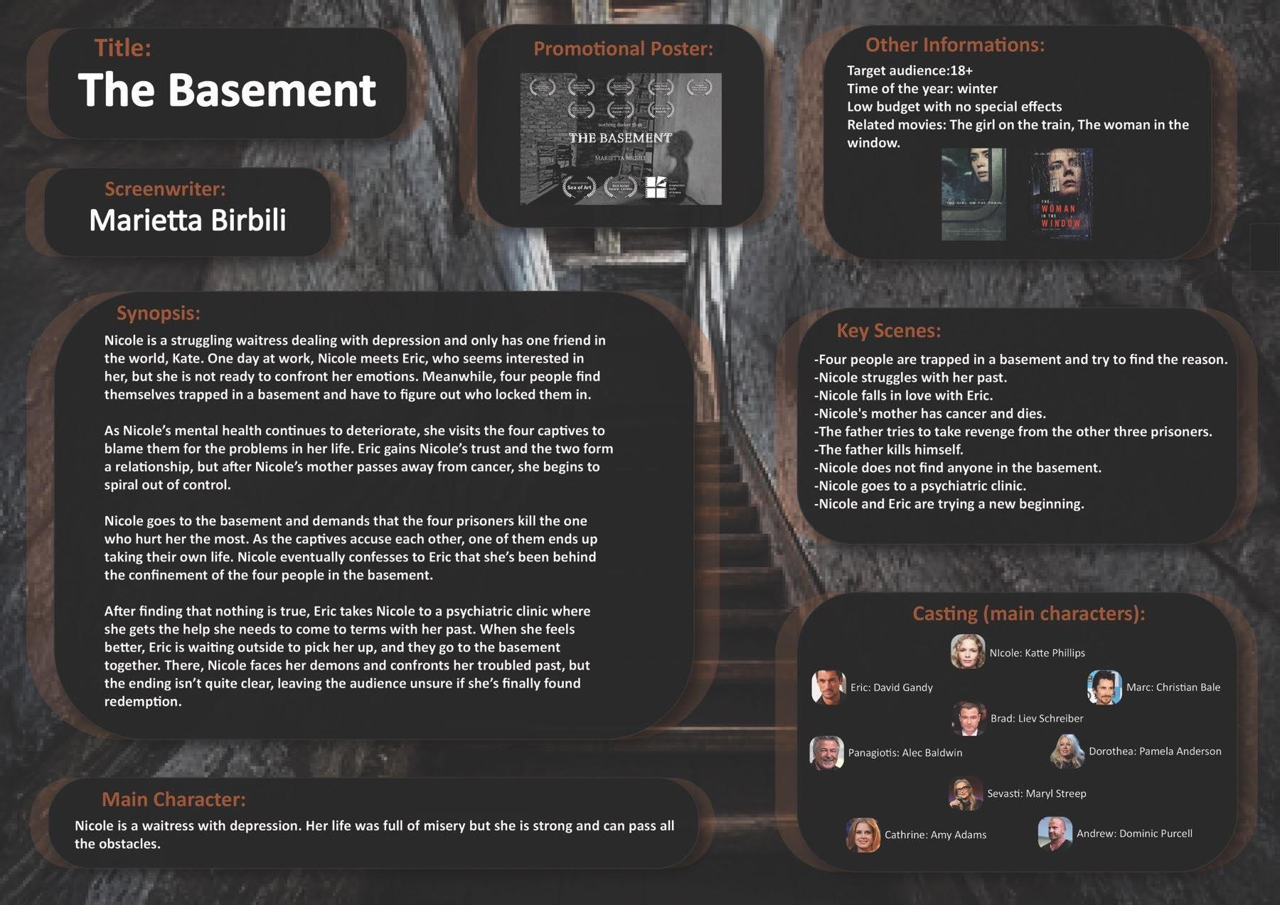 Nicole, a woman scarred by abuse and betrayal, traps in a basement those who destroyed her life and forces them to decide who will die. Caught between revenge, love, and loss, her mental balance hangs by a thread.Η Νικολέττα, μια γυναίκα σημαδεμένη από κακοποίηση και προδοσία, παγιδεύει σε ένα υπόγειο όσους της κατέστρεψαν τη ζωή και τους αναγκάζει να αποφασίσουν ποιος θα πεθάνει. Ανάμεσα στην εκδίκηση, τον έρωτα και την απώλεια, η ψυχική της ισορροπία κρέμεται από μια κλωστή.The Basement is my first feature-length screenplay—a psychological drama that many can relate to. After completing and translating it, I submitted it to international competitions, where it proved highly successful, winning thirteen distinctions so far. My dream is to see it come alive on the big screen one day.«Το Υπόγειο» είναι το πρώτο μου σενάριο μεγάλου μήκους· ένα ψυχολογικό δράμα με το οποίο μπορούν να ταυτιστούν πολλοί. Μετά τη μετάφρασή του, το έστειλα σε διεθνείς διαγωνισμούς, όπου η πορεία του αποδείχθηκε ιδιαίτερα επιτυχημένη, κερδίζοντας έως τώρα δεκατρείς διακρίσεις. Όνειρό μου είναι να το δω κάποια μέρα να ζωντανεύει στη μεγάλη οθόνη.The Basement has also been written as a novella titled In the Basement, which remains unpublished.Το υπόγειο έχει γραφτεί και σε μορφή νουβέλας με τον τίτλο "Στο Υπόγειο", η οποία είναι ακόμα ανέκδοτη.